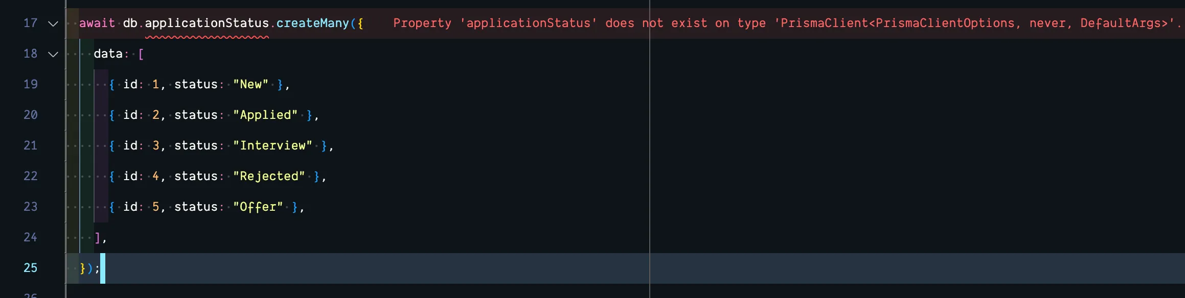• On line 17-25, we’re adding all the job application statuses to the database. We’re using a standard Prisma createMany function. This takes a data array of objects. Each object contains the data for a single record.