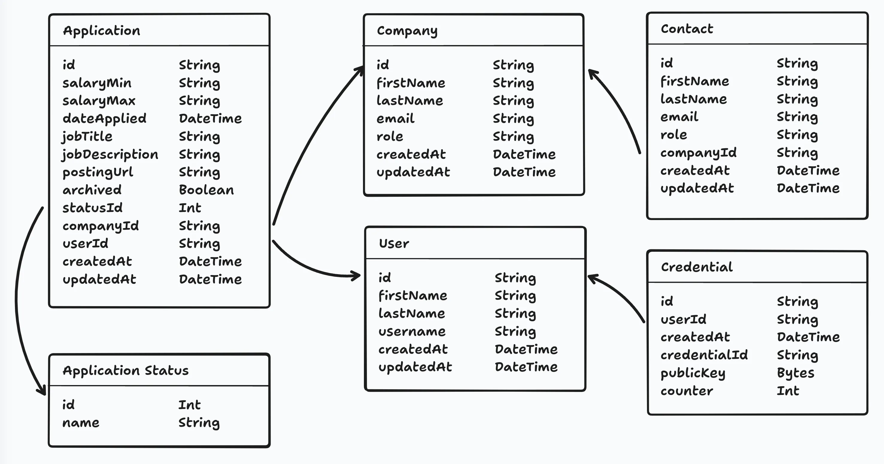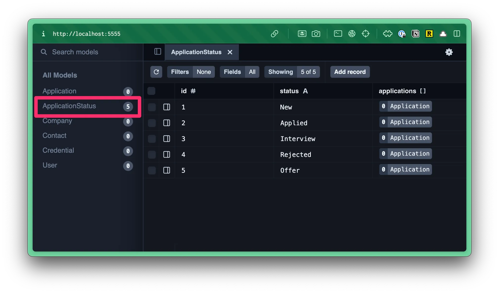 Application Statuses are a little different, but the same principle applies. To avoid duplication, we will give statuses their own model. We will have a set of fixed status options (New, Applied, Interviewing, Offer, and Rejected).