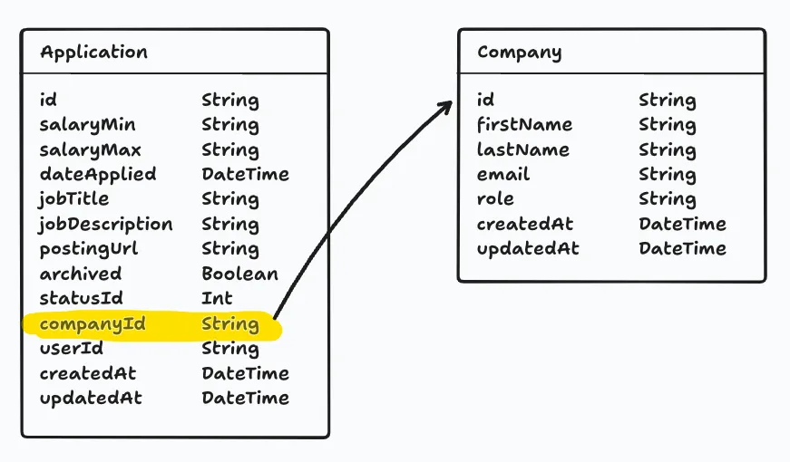 The “trick” with database design is to prevent duplication. For example, we want to store the company information for each job application. There’s a chance we’ll have multiple job applications for the same company. If we store the company information directly in the Application model, we might have duplicate entries. This could create all kinds of problems. If something changes, every instance of the company information would need to be updated. Plus, there are also formatting issues to consider: is it RedwoodSDK, redwoodsdk, redwood-sdk, or RedwoodSdk?
