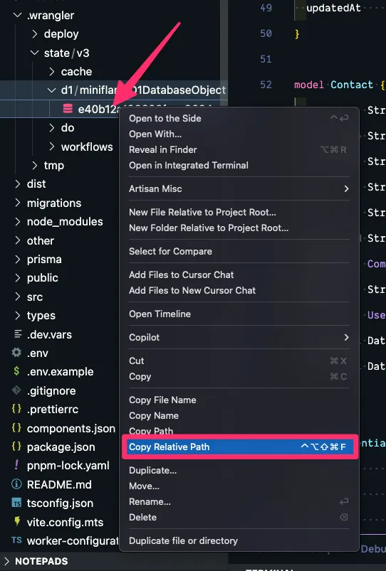 Within the file explorer, navigate to your D1 database. You can find it in the .wrangler > state > v3 > d1 > miniflare-D1DatabaseObject folder.