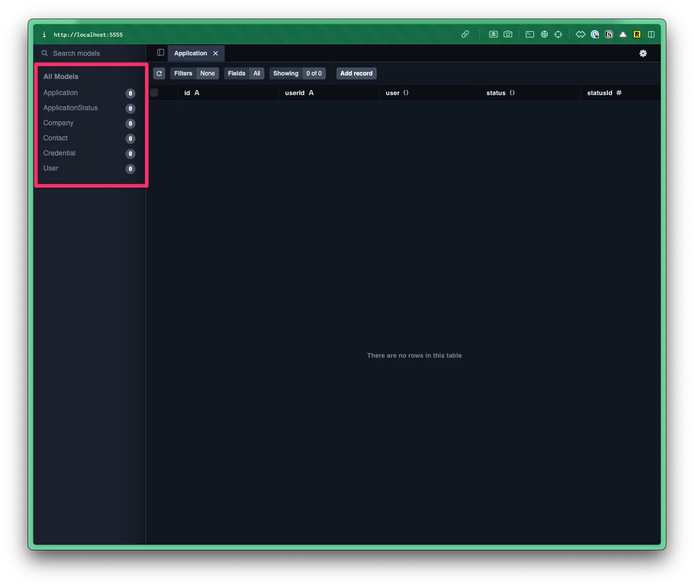 • Within Prisma Studio, you can see a list of all your tables/models on the left.