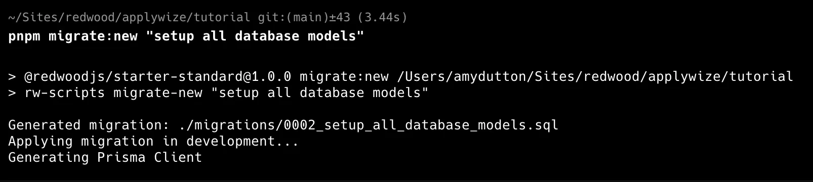 Let’s create the migration by running migrate:new and give our migration a name. Since this is our first migration, we’ll say: setup all database models.