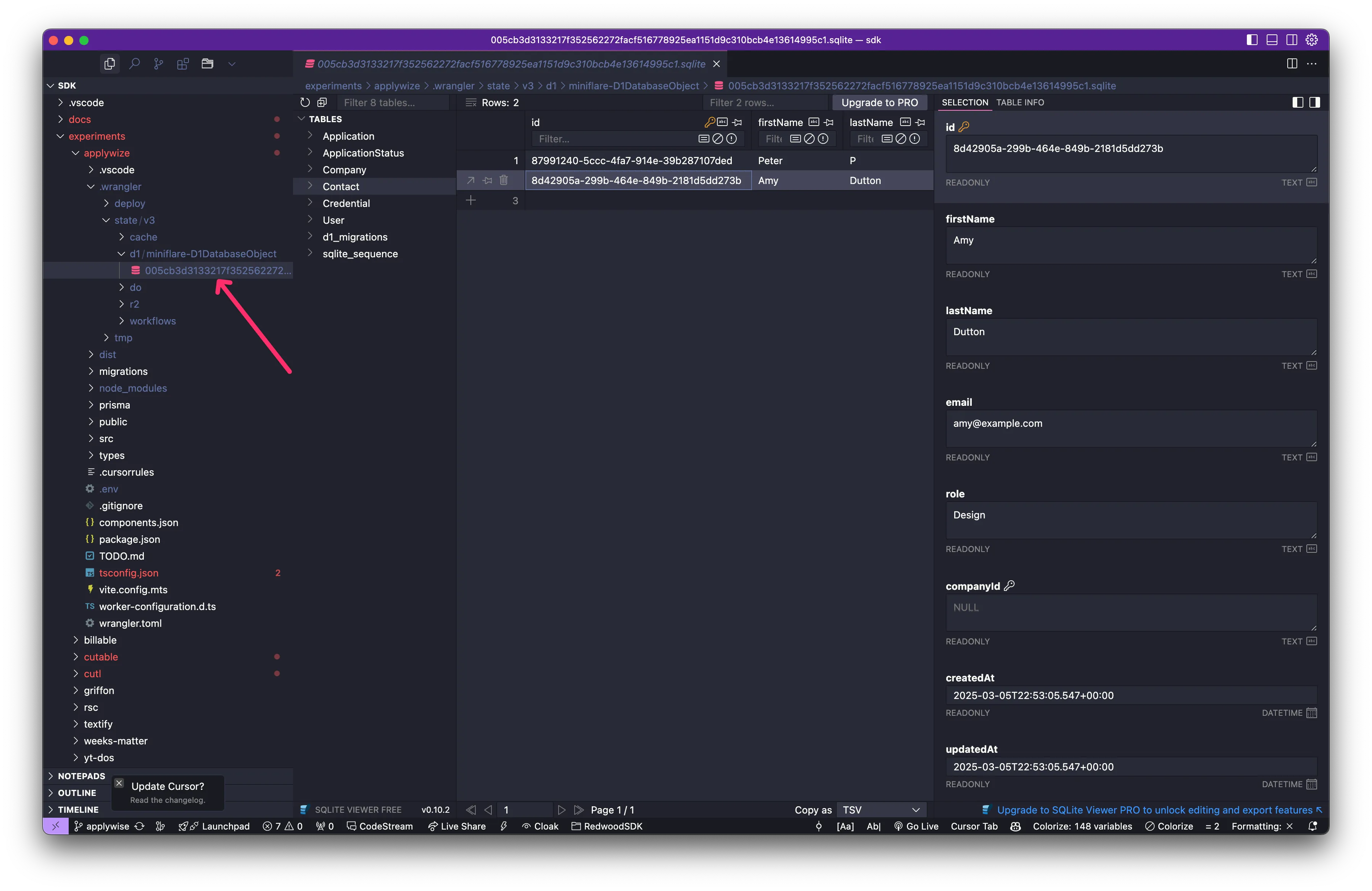 First, let’s go to our d1 database. This is inside the .wrangler/state/v3/d1/miniflare-D1DatabaseObject directory.