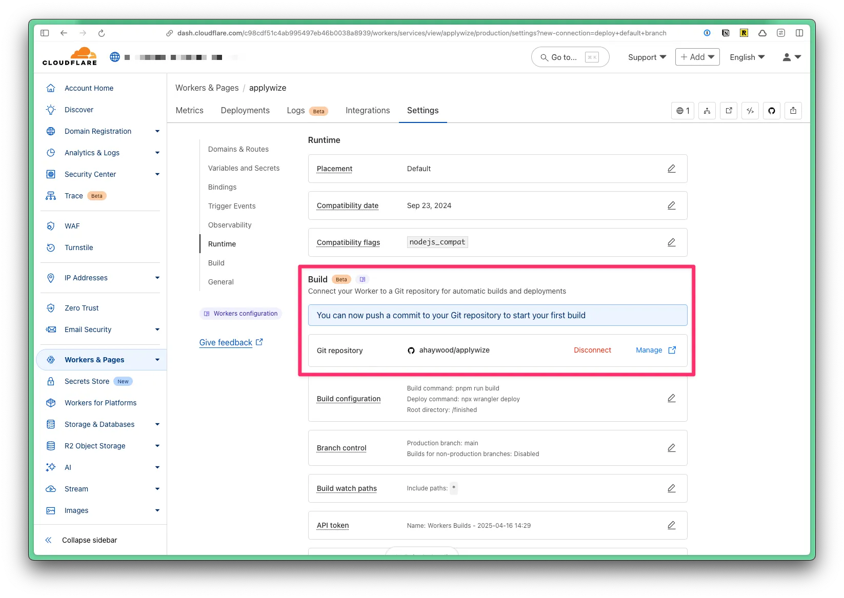 You can connect your application to GitHub, so that anytime you push a commit to a given branch, it will automatically deploy your application. Go to Workers & Pages in the left side navigation. Then, click on the name of your project. Click on the Settings tab. Near the bottom of the page, you’ll find a section called Build where you can connect GitHub.