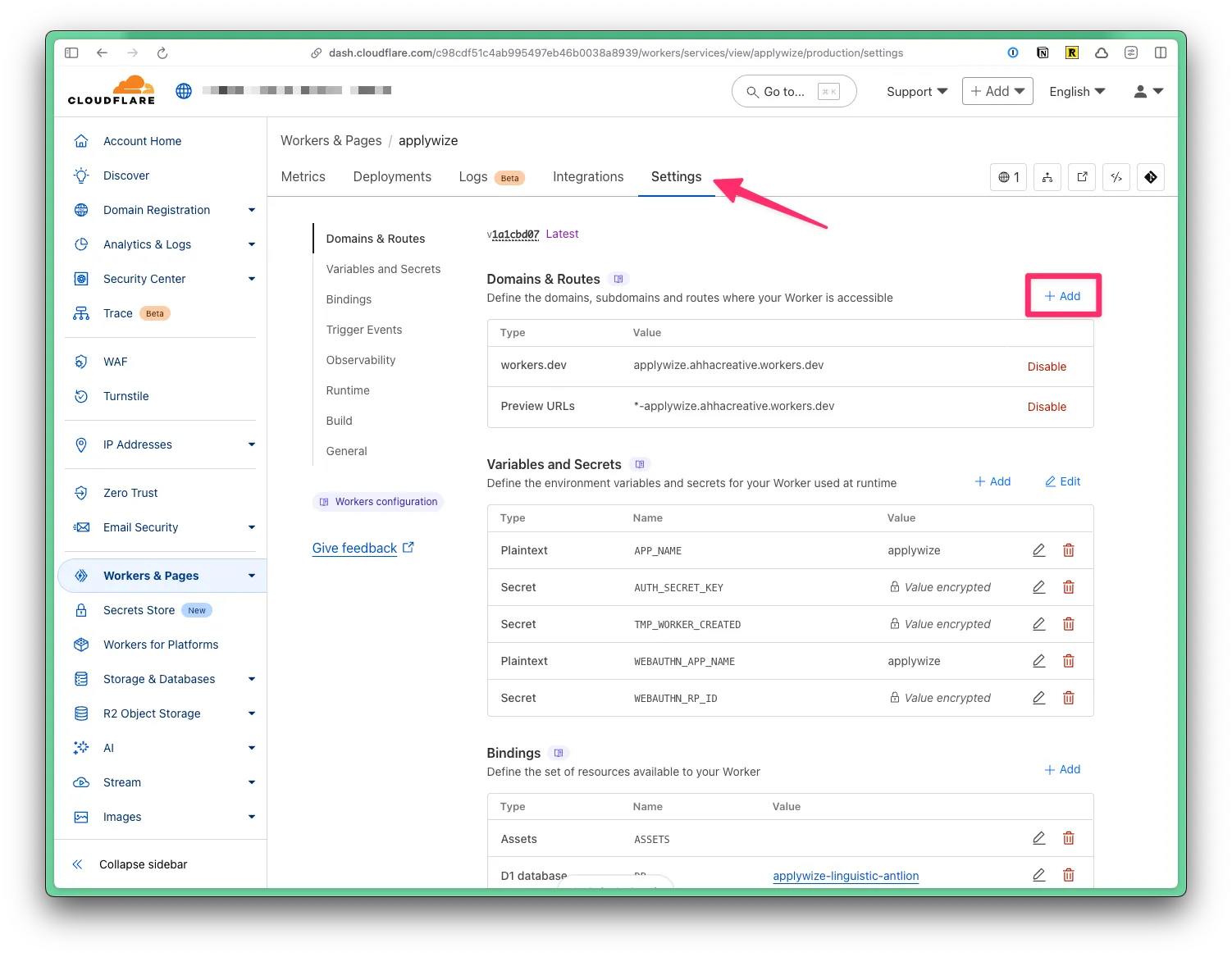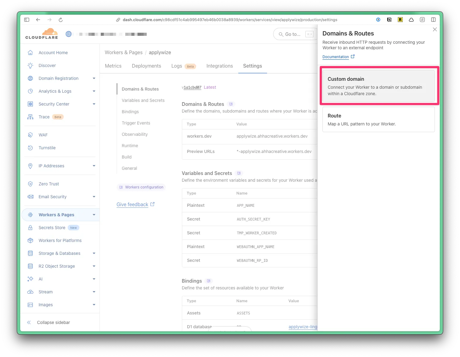 To use a custom domain name, go to Workers & Pages in the left side navigation. Then, click on the name of your project. Click on the Settings tab. At the top, you’ll see the domains associated with your project.