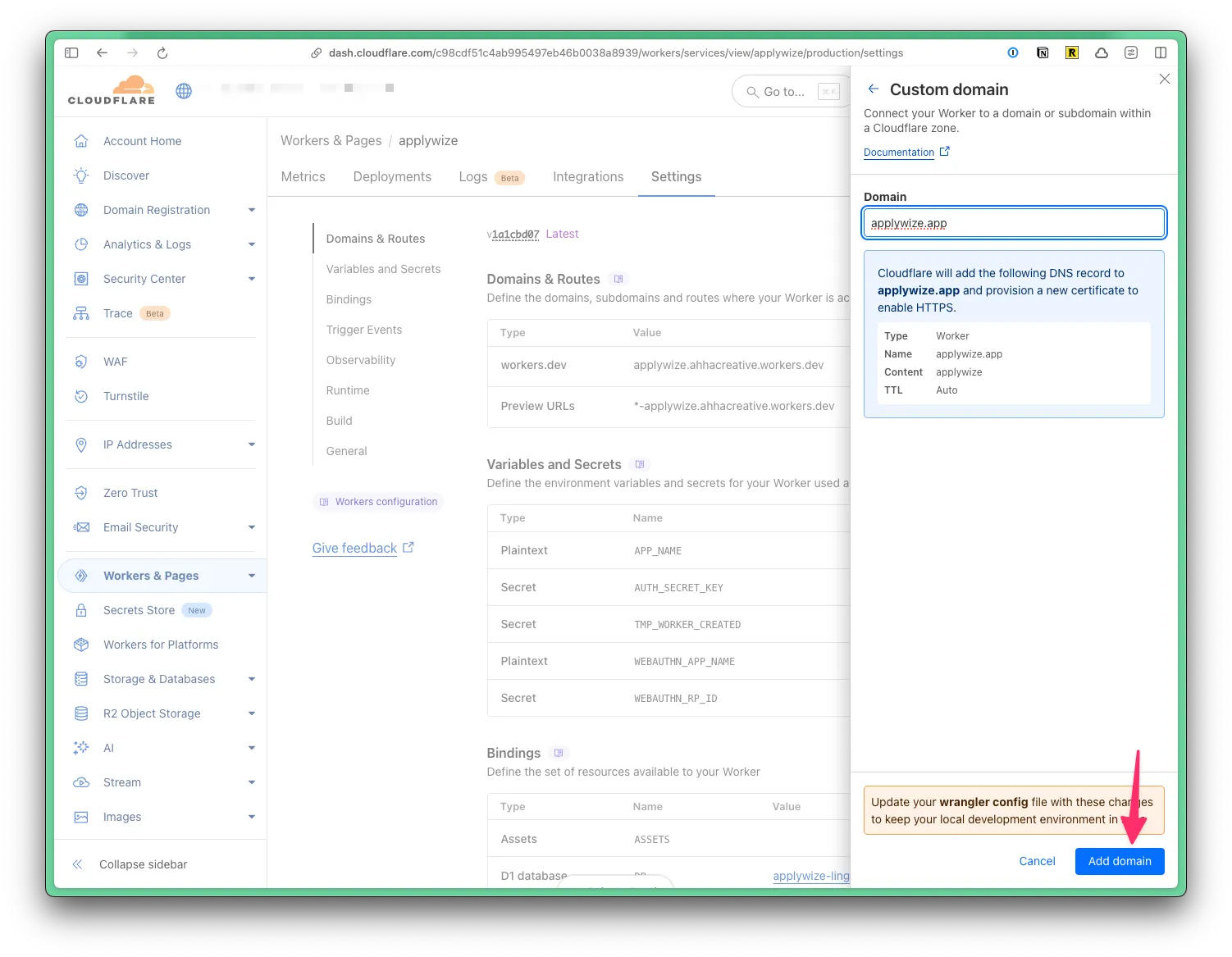 I had already purchased applywize.app through Cloudflare, so there was nothing else I needed to do. Cloudflare was able to resolve the domain and assign SSL certificates.